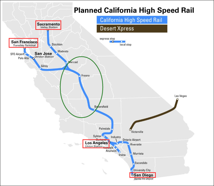 加州高铁项目示意图。绿色圆圈内为州长纽森削减项目后剩下的一小段。